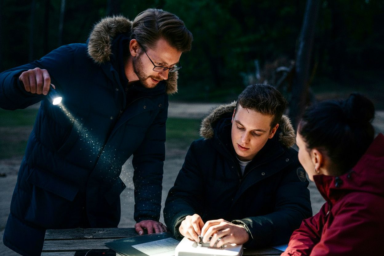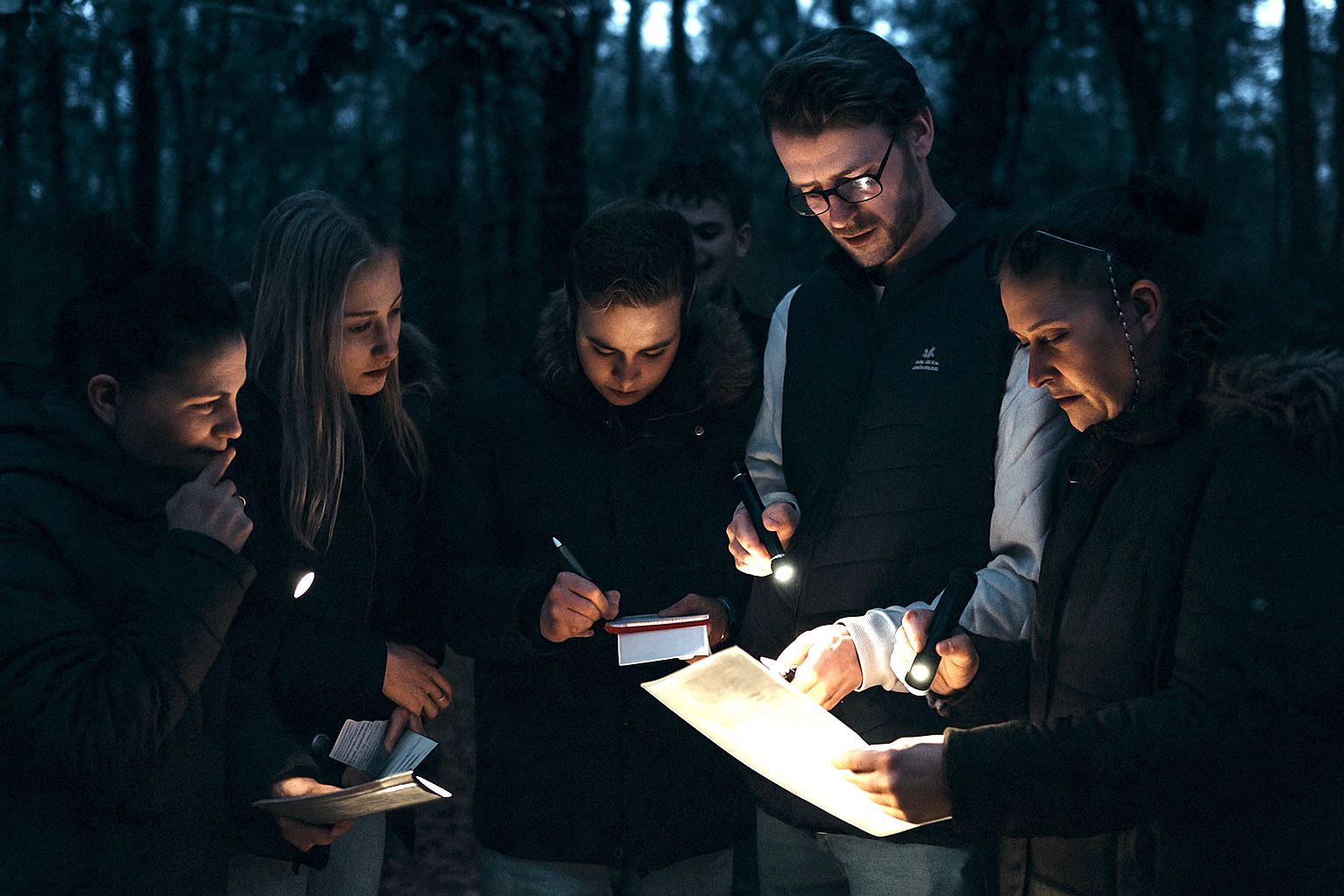 Daarna trekken jullie het donkere bos in, gewapend met een zaklamp, teamdossier en een flinke portie lef.